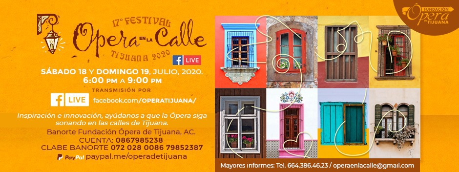 Debido a la contingencia sanitaria por COVID-19 y a la imposibilidad de llevar a cabo eventos masivos en la ciudad, el Festival Ópera en la Calle 2020 se llevará a cabo en línea, vía Facebook live, mismo que podrá seguirse a través de la página www.facebook.com/OPERATIJUANA, este sábado 18 y domingo 19 de julio, con un horario de 6:00 a 9:00 p.m.