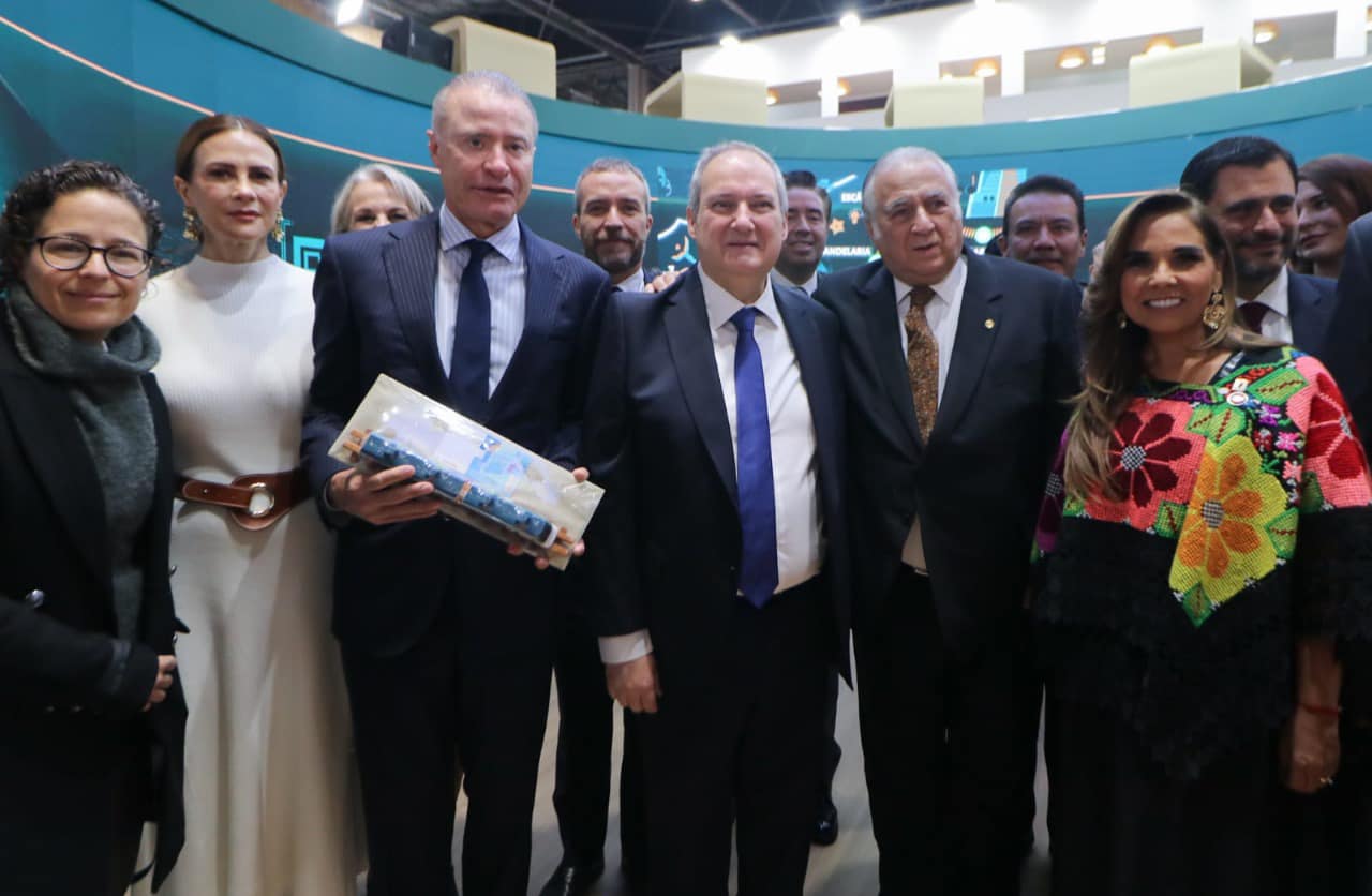 Junto con el ministro de Industria y Turismo del Gobierno de España, Jordi Hereu Boher, y la secretaria de Estado de Turismo del Gobierno de España, Rosa Ana Morillo Rodríguez, la comitiva de México inauguró el espacio del Tren Maya en FITUR 2024, que nuevamente forma parte del pabellón de México, ahora con dos tramos ya en funcionamiento, y que próximamente contará con los mil 554 kilómetros de extensión, en los cinco estados del sureste del país.